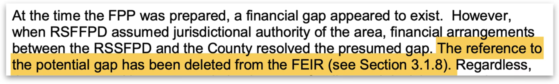 The County ultimately gave RSF Fire a one-time payment of $2.5 million which was supposed to be amortized over 8 years. Interestingly, it expires this year, just in time for HGVS to be approved. This was far from sufficient to resolve the shortfall. When HGV South came along, the environmental documents made extensive reference to “helping solve the shortfall.” After the community provided a comment on this, the County revised the documents to note that “financial arrangements” resolved the gap. What exactly were those arrangements?