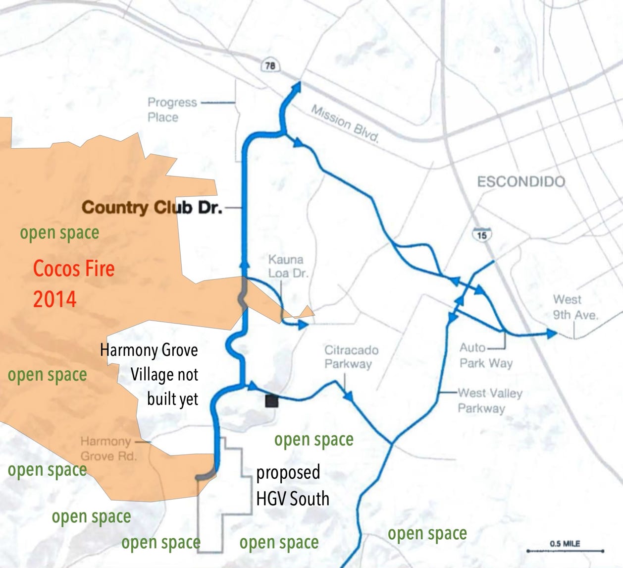 In 2014, the Cocos Fire became the latest in a long history of fires that overtook this part of the community. Over 30 structures were lost when a fire right next to the proposed project. The fire started in San Marcos and sped through the open space and hurtled towards homes on Country Club Road south of Harmony Grove Road, catching residents off guard. Residents reported long lines of traffic to exit the area due to congestion from vehicles and horse trailers. Some barely were able to get out in time. This was before Harmony Grove Village (not HGV South) was built that would ultimately add another 1,500 vehicles to the evacuation traffic on the two lane road.